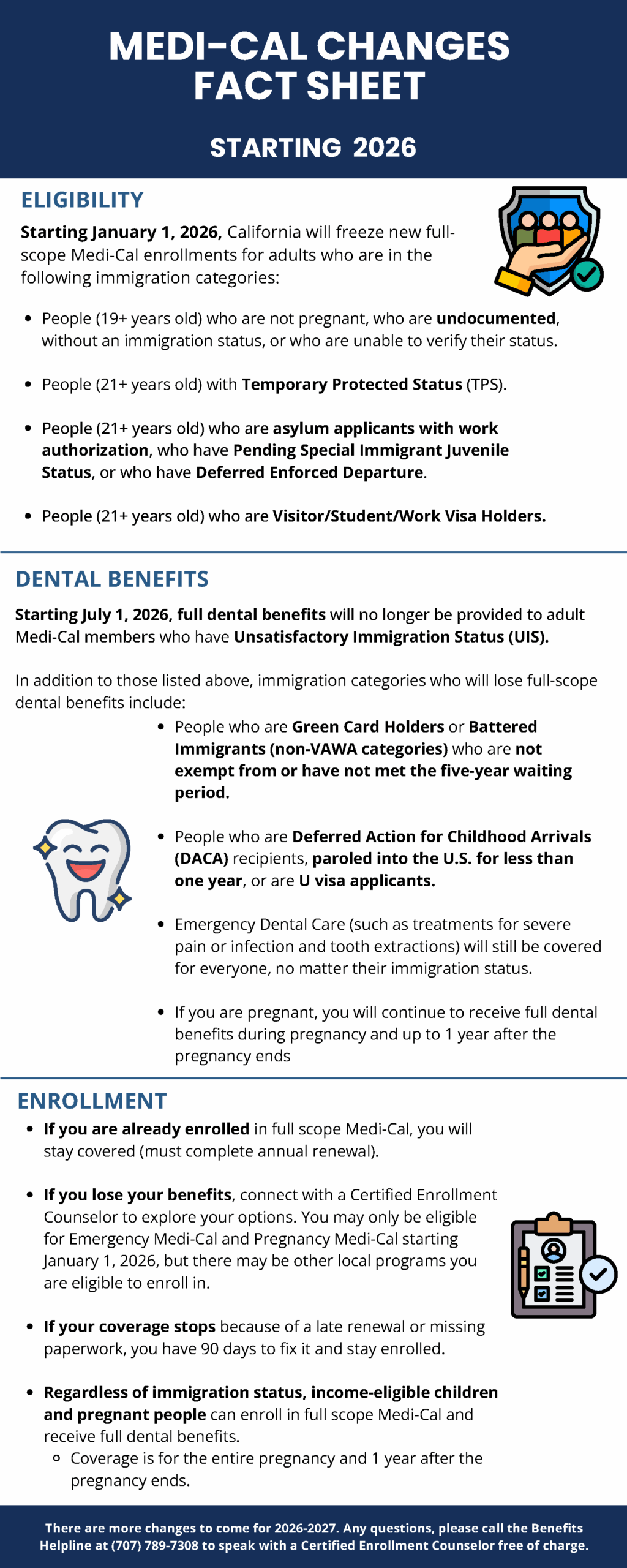 - If you lose your benefits, connect with a Certified Enrollment Counselor to explore your options. You may only be eligible for Emergency Medi-Cal and Pregnancy Medi-Cal starting January 1, 2026, but there may be other local programs you are eligible to enroll in.